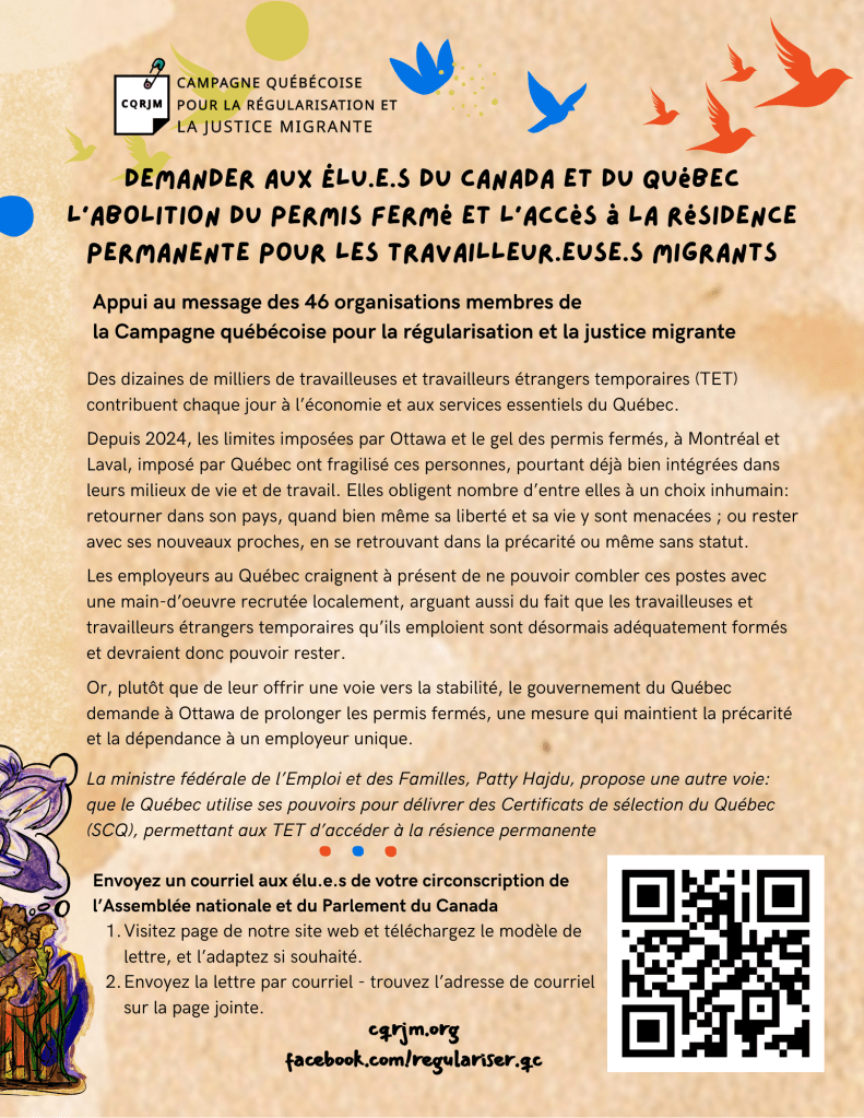 Appui au message des 46 organisations membres de la Campagne québécoise pour la régularisation et la justice migrante